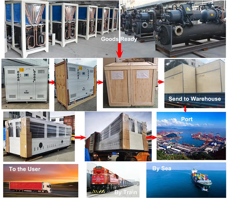 Como fornecedor e exportador profissional de resfriadores de água, temos nosso próprio despachante para organizar o envio. Nossa máquina de resfriamento é com embalagem de madeira compensada, que evita danos durante o transporte e atende aos padrões de exportação.